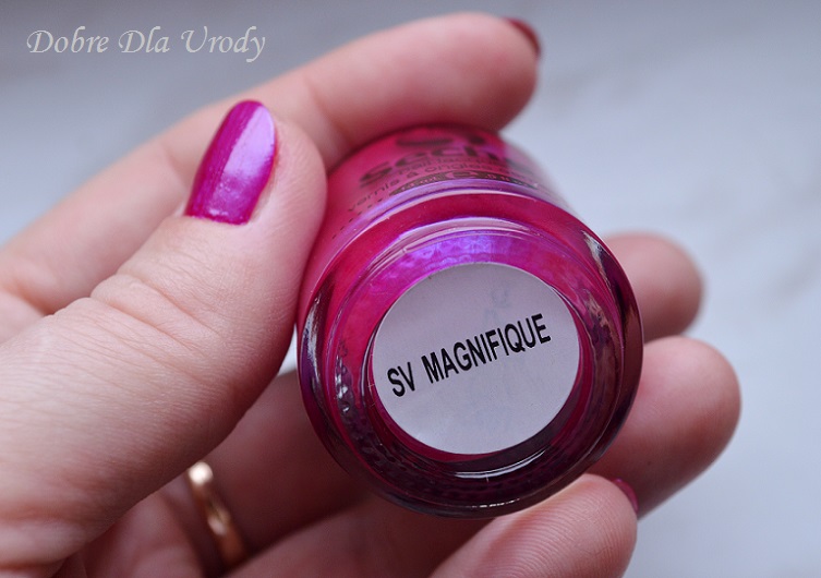 Lakier o ślicznym, intensywnym odcieniu fuksji wymieszanym z opalizującą niebiesko - fioletową poświatą, ma bardzo przyjemną konsystencję, nie jest zbyt płynny, ani też za gęsty, idealny.